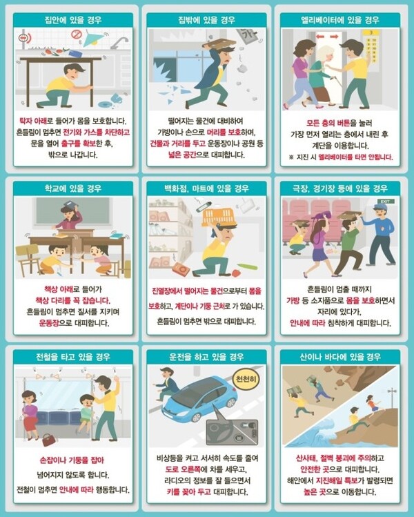1. 실내: 튼튼한 탁자 아래로 들어가 몸을 보호합니다.