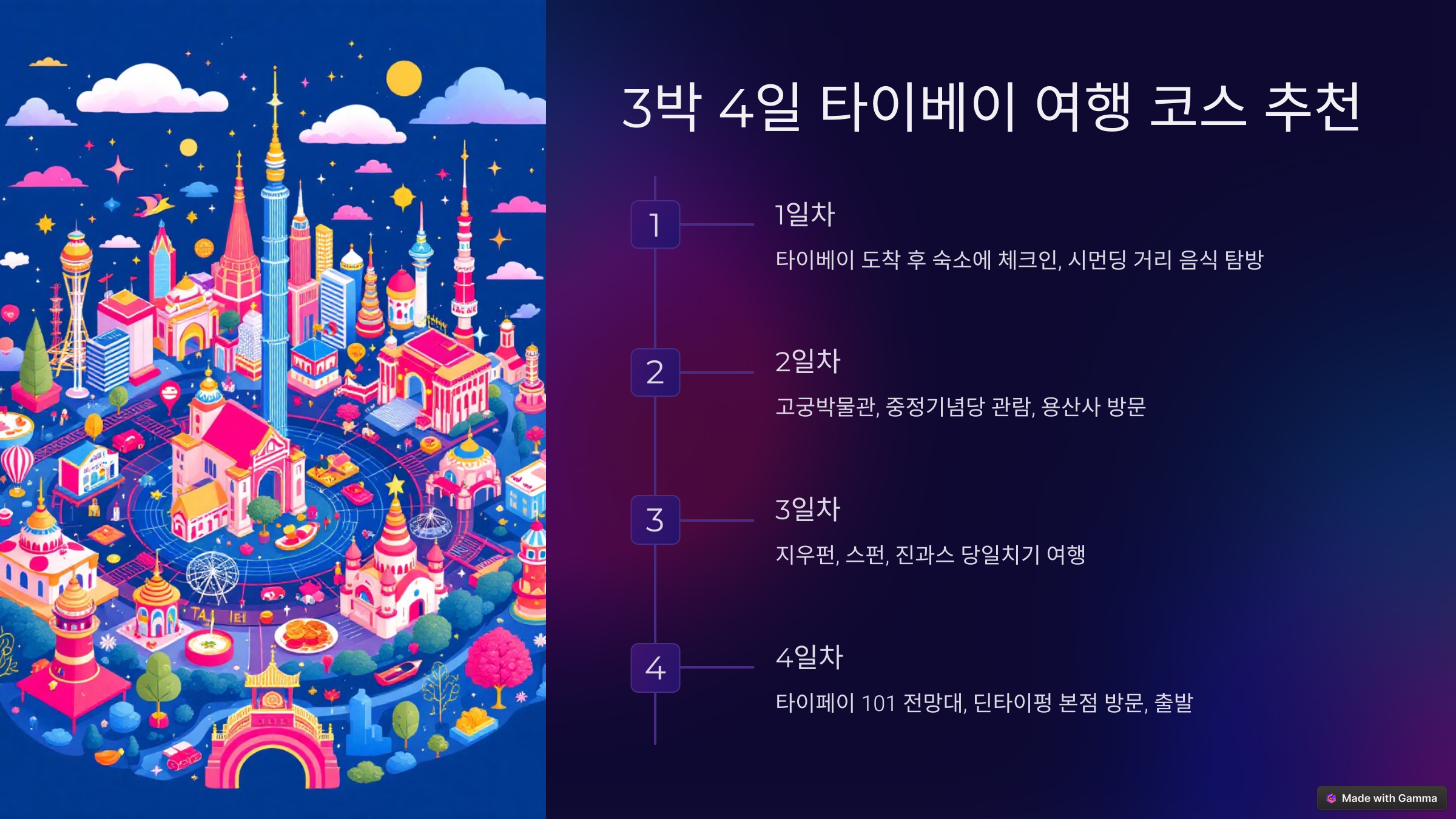 특히 첫 대만 여행이라면 타이베이 중심 일정이 가장 효율적입니다. 짧은 기간에도 알찬 여행이 가능하며, 야시장과 랜드마크, 근교 투어까지 한 번에 즐길 수 있습니다.