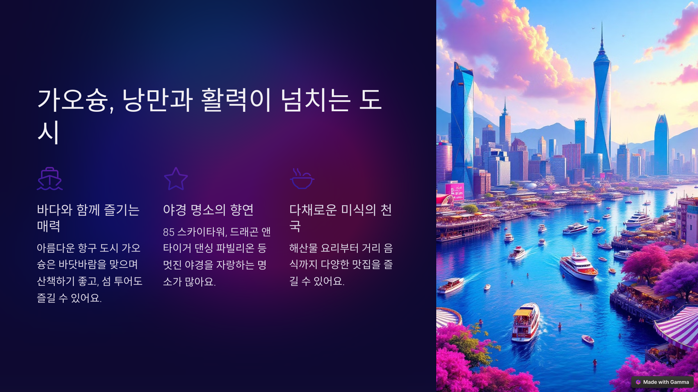 | 가오슝 | 남부 대표 도시, 바다와 야경 | 류허 야시장, 용호탑 |